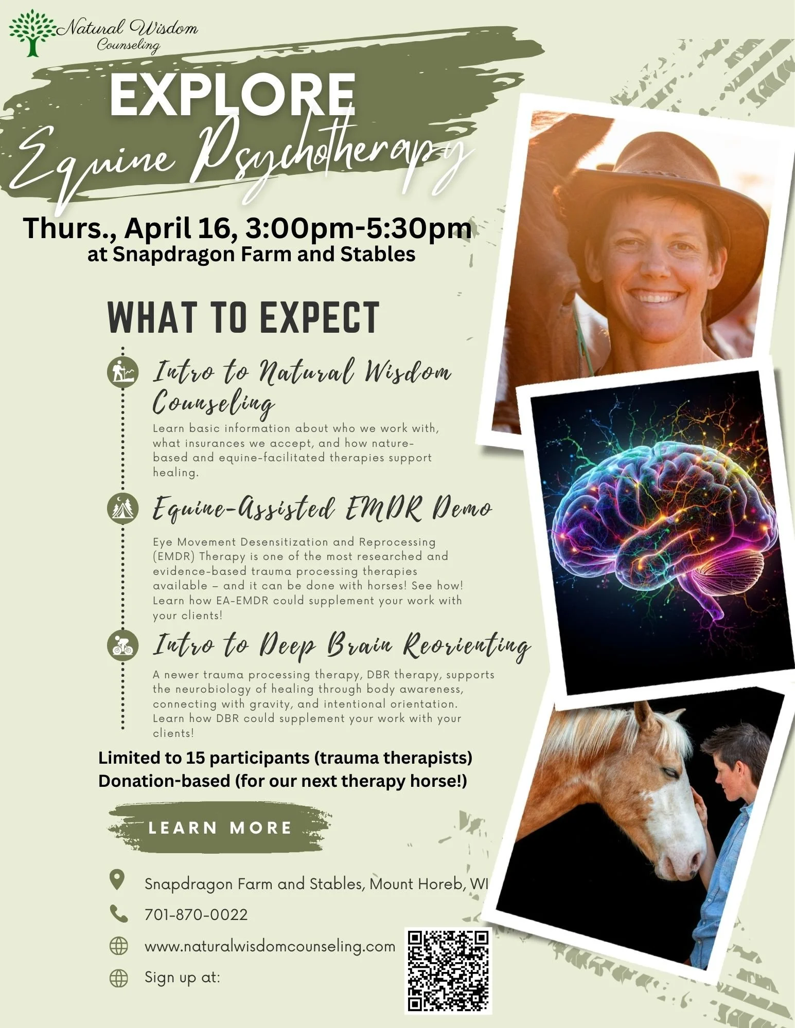 Explore Equine Pyschotherapy: For Therapists Thursday, April 16, 2026 3:00 PM 5:30 PM 15:00 17:30 Natural Wisdom Counseling LLC Mount Horeb, Wisconsin (map) Google Calendar ICS Register Here